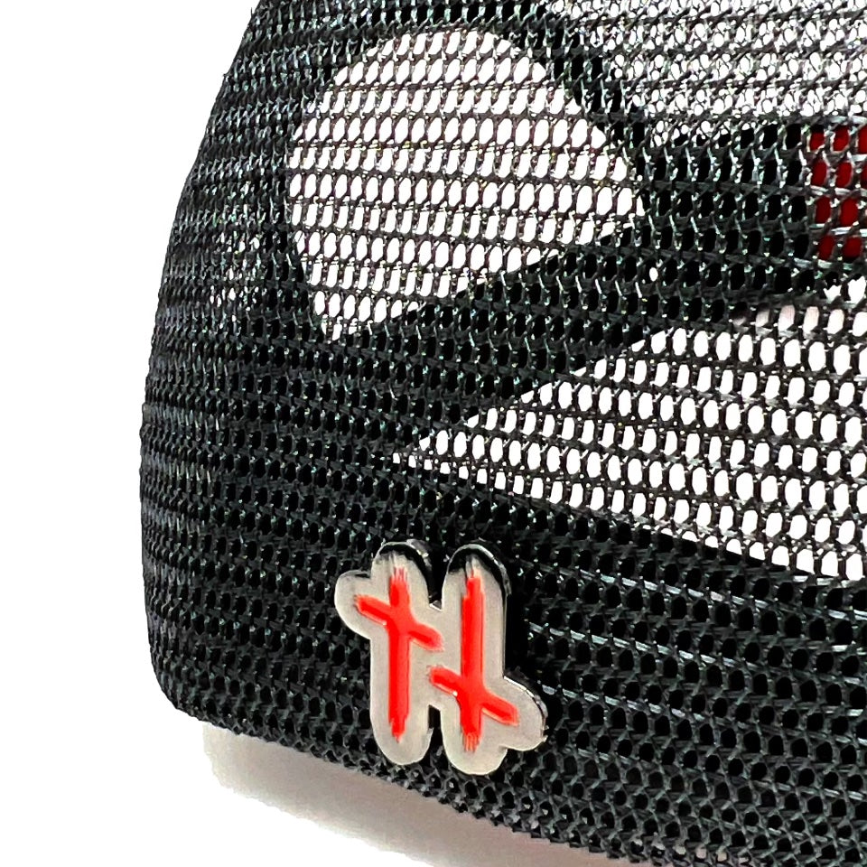 Custom cotton twill snapback hat with cycloon logo and metal pins.